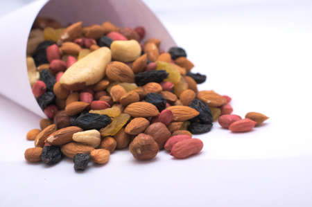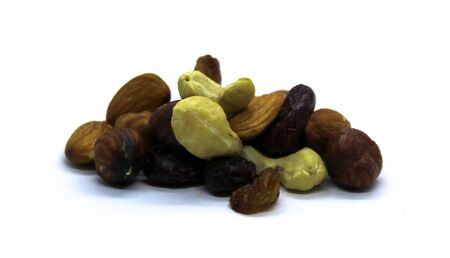 Isolated on white background. Hazelnut, almond, dried raisins, dried cranberries, cashew nut, pumpkin seeds.