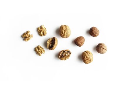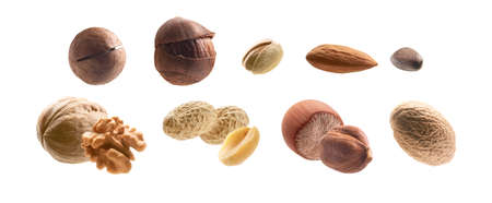 Nuts in the air on a white background, flying nuts. Healthy Brain Food, Diet, Protein, Almonds, walnuts and hazelnuts peanut