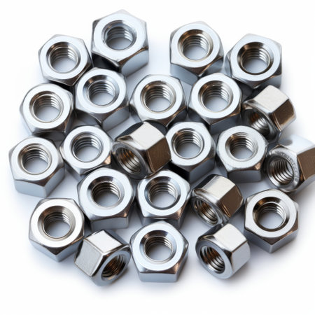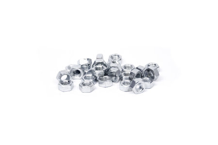 Metal nuts made of steel. Hexagon nuts scattered on white background