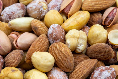 Close-up shot of mixed nuts, featuring a variety of textures and shapes including cashews, walnuts, pecans, and almonds