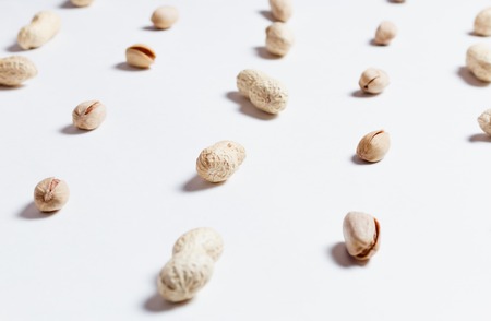 Various nuts: pistachio and shell peanuts repetition on white background as pattern, shallow depth of field.