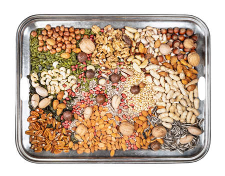top view of steel tray with various shelled nuts and seeds cutout on white background