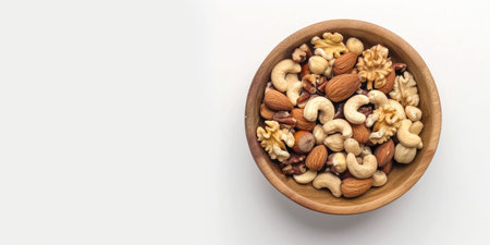 An inviting display of assorted nuts including almonds, cashews, walnuts, and pecans in a ceramic bowl positioned on a clean white background, perfect for healthy snack ideas.