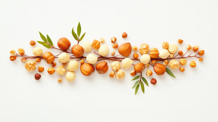 This vibrant arrangement features a variety of nuts and crunchy snacks on a clean white background, accented by fresh green leaves, ideal for culinary use.