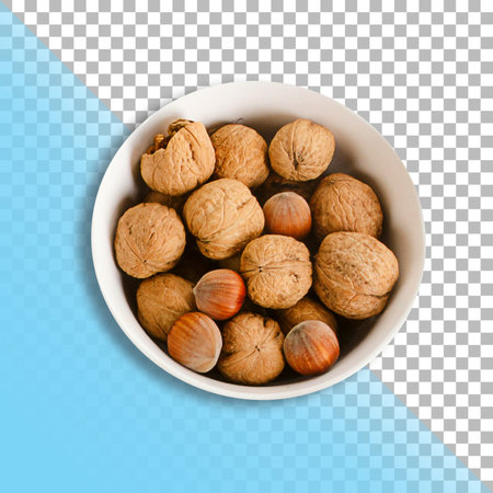 Top up view bunch of walnuts on white bowl isolated with transparent background.