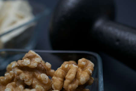 Closeup on dumbbell, walnuts, and tofu on dark background.