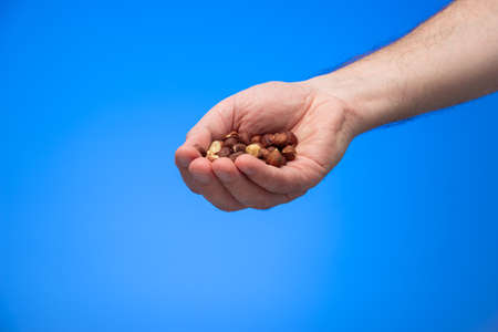 Group of various nuts held in palm by Caucasian male hand isolated on blue background studio shot.