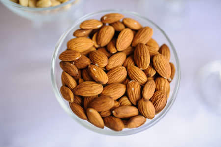 Top view set of healthy nuts in a bowl. Plate consists of healthy cashew, almont and walnut nuts