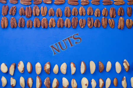 Pekan and brazil nuts on blue background. Healthy food. Closeup
