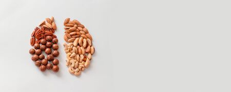 Cashews and almonds are laid out on a white background in the shape of a heart. Proper nutrition, healthy snack. Healthy heart.