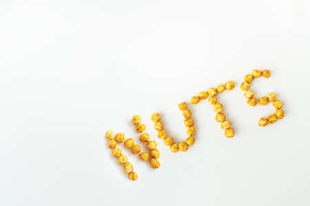 Scattered hazelnuts in caramel on a white background. Very tasty and healthy and high-calorie dessert. Walnut inscription