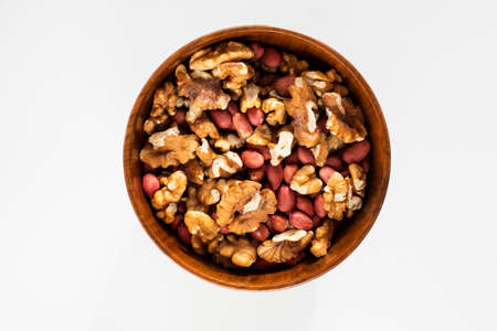 brown clay bowl with nuts: walnuts, almonds and hazelnuts on a wooden background and a few nuts around: walnuts, almonds and hazelnuts