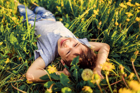 preschooler boy lies in grass in blooming dandelions and smiles