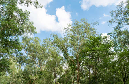 Green leaves and blue sky with white clouds in the forest background.