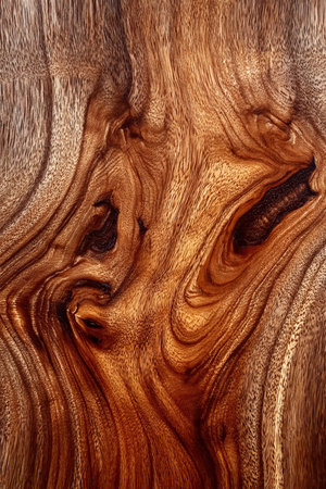 Detailed view of dark brown wood grain with prominent knots and swirling patterns.