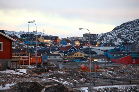 Arctic streets with houses on the rocky hills in sunset city panorama. Nuuk, Greenland