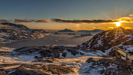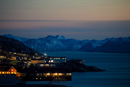Sunset and colorful arctic houses at the Nuuk fjord, Nuuk Greenland