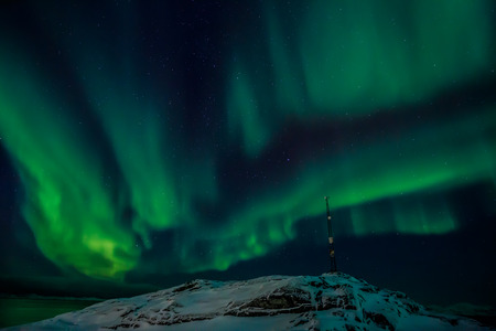 Radio tower on the hill and the Northern lights over the fjord in the background, Nuuk Greenland