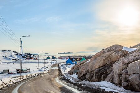 Acrtic road to the docks and port between the rocks with Inuit houses, Sisimiut, Greenland