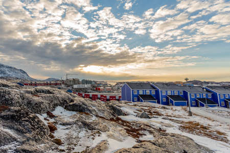 Arctic Inuit houses on the rocky hills in sunset panorama. Nuuk, Greenland