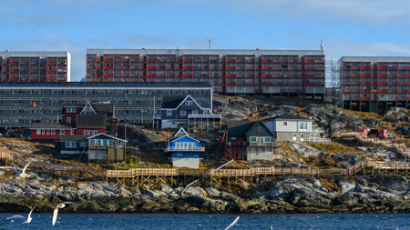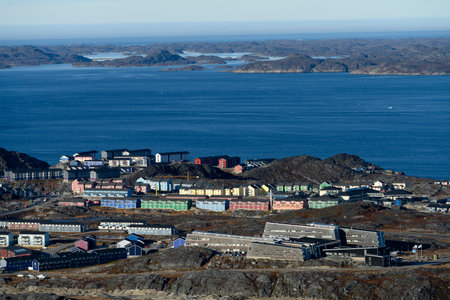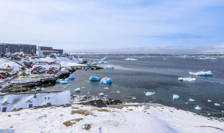 Panoramic view of Greenland capital Nuuk with colored houses located near fjords and icebergs.