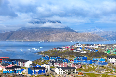 Aerial View of Arctic city of Ilulissat, Greenland. Colorful houses in the center of the town with icebergs in the background in summer on a sunny day with blue sky and clouds. Photo taken in Greenland.