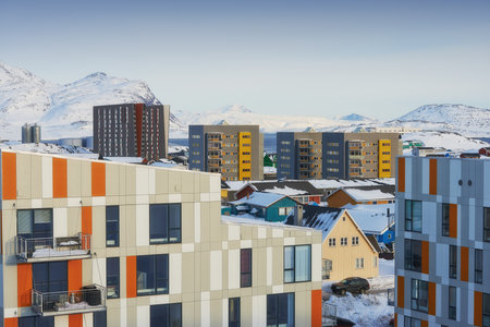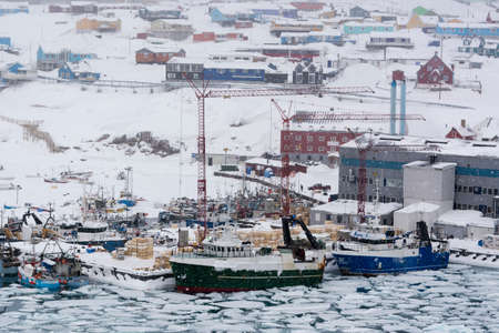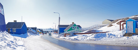 Arctic city center panorama with colorful Inuit houses at the fjord covered in snow, Ilulissat, Avannaata municipality, Greenland