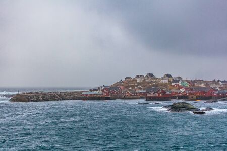 Colorful houses on the rocks in Saqqaq village, western Greenland. Summer greenlandic landscape at foggy day