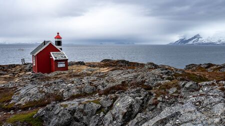Red house and lighthouse in norwegian fjord