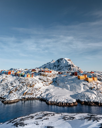 Rows of colorful Inuit houses hiding in the snow and rocks with fjord in the background, suburb of arctic capital Nuuk, Greenland