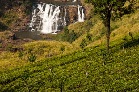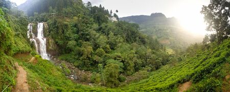 Beautiful panoramic photo of waterfall and tea plantation on the mountain slope at tropical forest