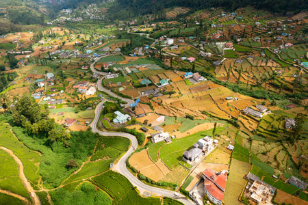 Village against tea plantation in clouds. Agriculture landscape in Sri Lanka.