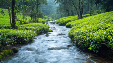 A serene stream flowing through a tea plantation in South Asia, with lush green tea bushes on either side.