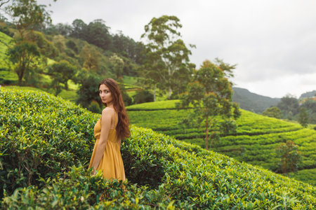Woman in Yellow Dress Exploring Lush Green Tea Plantations in Sri Lanka