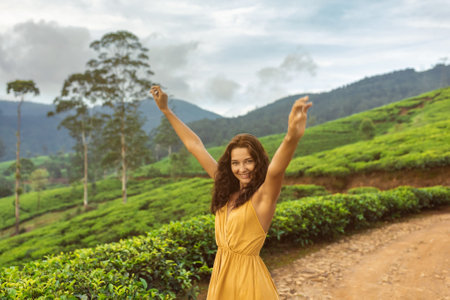 Joyful Woman in Yellow Dress Enjoying Tea Plantations in Sri Lanka
