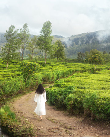 Woman in White Walking Through Lush Tea Fields in Misty Nuwara Eliya, Sri Lanka