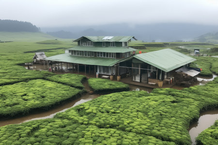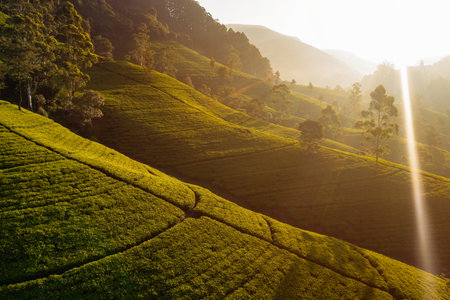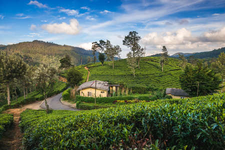 scenery of tea garden with farmhouse at sri lanka at dawn