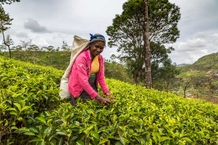 NUWARA ELIYA, SRI LANKA - FEBRUARY 15, 2020: Woman tea picker in tea plantation in Nuwara Eliya, Sri Lanka