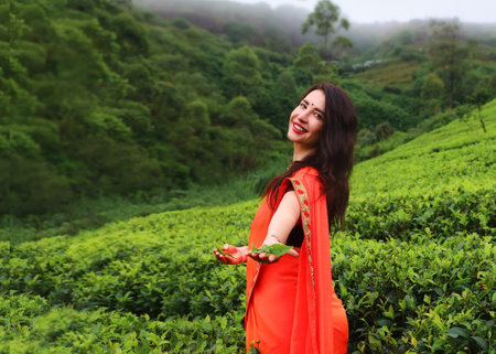 A girl in a red sari against the background of a tea plantation
