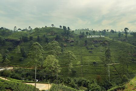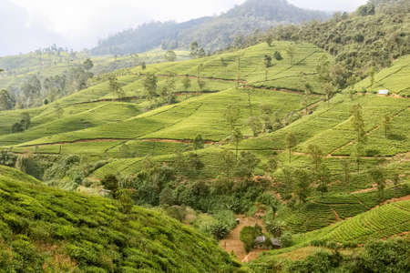 Tea plantations on hillsides in a mountainous province. Tea estate landscape. Nuwara Eliya, Sri Lanka.
