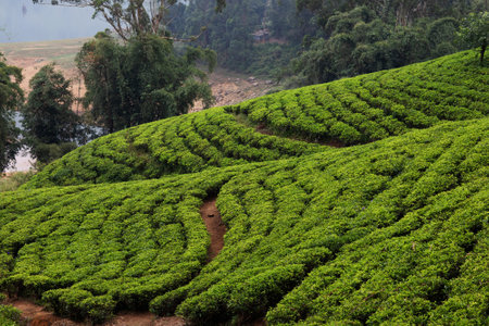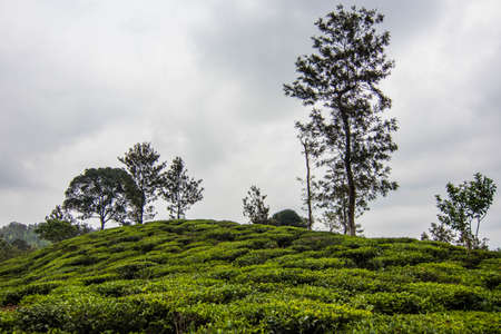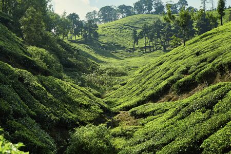 Tea gardens in the foothills of western ghat image take at India. The landscape is amazing with Green tea plantations in rows.