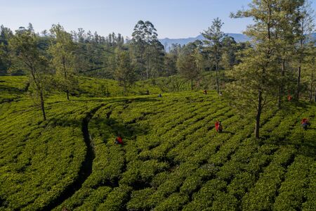 Aerial view of a plantation and people picking tea on the island of Sri Lanka.