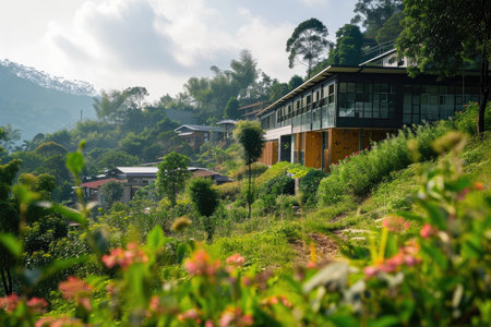 An eco-friendly school building blending into a lush landscape AI generated