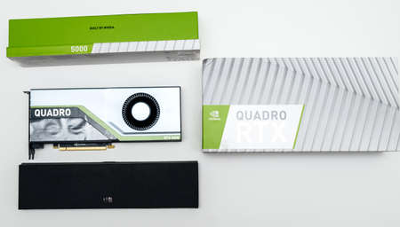 Paris, France - Feb 20, 2019: Unboxing of the latest Nvidia Quadro RTX 5000 workstation professional video card GPU for professional CAD CGI scientific calculations and machine learning