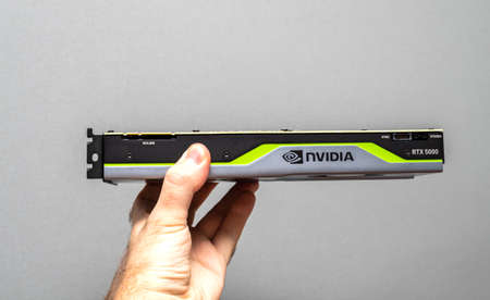 Paris, France - Feb 20, 2019: Man holding latest Nvidia Quadro RTX 5000 workstation professional video card GPU for professional CAD CGI scientific machine learning above view