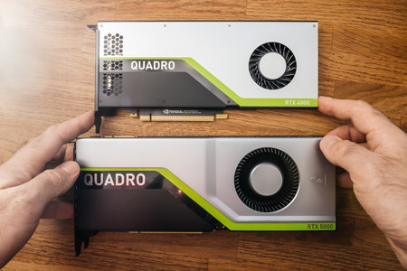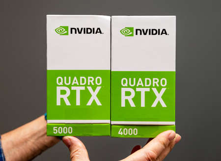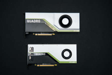 Paris, France - Mar 15, 2019: View from above of new Nvidia Quadro RTX 5000 and RTX 4000 cards Quadro is Nvidia brand for graphics cards intended for use in workstations running professional applications