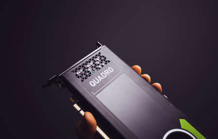 Paris, France - Sep 30, 2019: POV male hand showing demonstrating new professional Nvidia Quadro P4000 using Pascal microarchitecture black gray background
