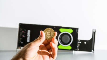 hand holding bitcoin with professional nVidia Quadro K2200 GPU