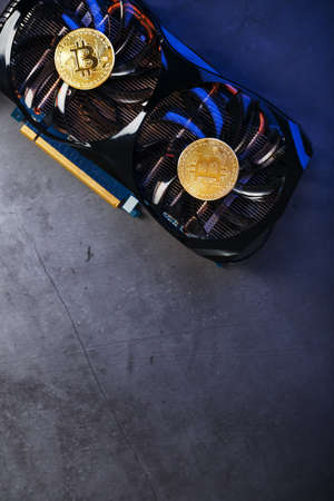 Bitcoin coin on a powerful graphics card for mining and earning cryptocurrency concept on a dark background. Technologies of the future currency. Top View, Selective Focus