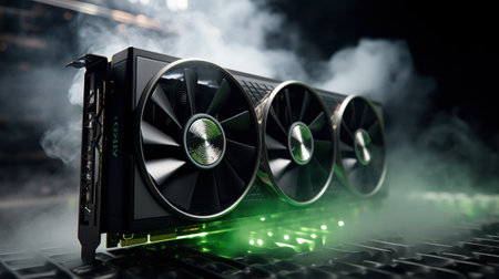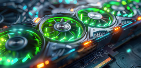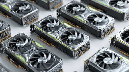 Close-up of new graphic processing units (gpus) with illuminated cooling fans and visible electronic components, highlighting the advanced technology